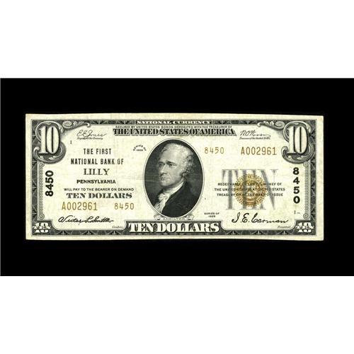 <B>Lilly, PA</B></I> - $10 1929 Ty. 2 <B>The First NB</B></I> Ch. # 8450<BR>This was the only issuer from this Cambria County locale and ordered only the $10 denomination in Red Seals, Date Backs, Plain Backs and both varieties of the 1929 series. We offer a well centered <B>Very Fine</B></I> tonight.<BR><BR><b>Shipping:</b> Coin/Currency (<a target="_blank" href="http://www.heritageauctions.com/common/shipping.php">view shipping information</a>)