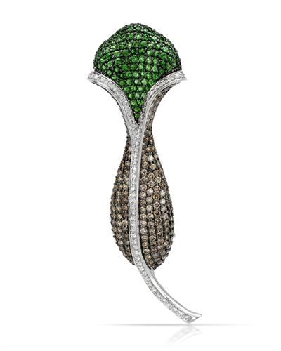 Lily Brown Diamond and Tsavorite Brooch in 14K Two-tone Gold | 156200 Grams, featuring 2.8 Brown Diamond Round ct 110 3.69 White Diamond Round ct 184 0.81 ct 61 14 ct