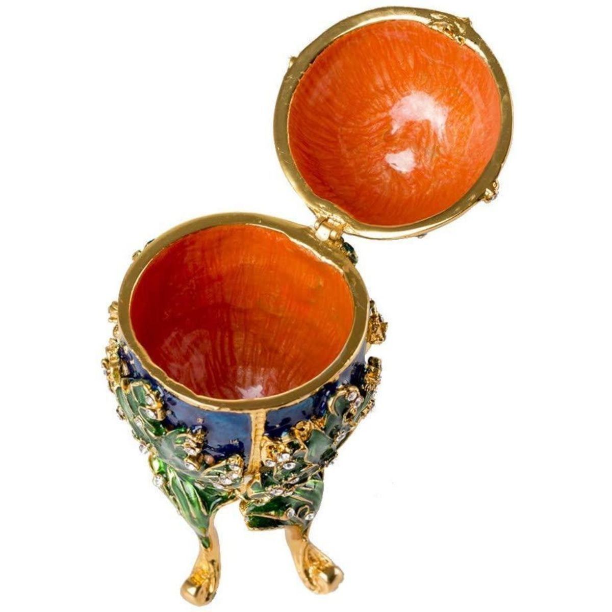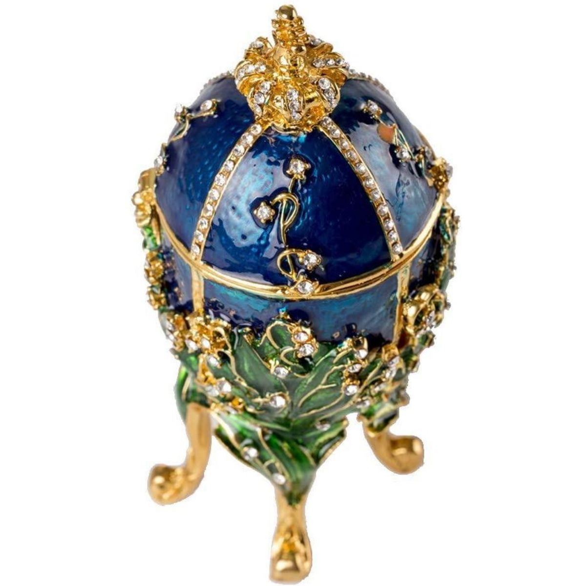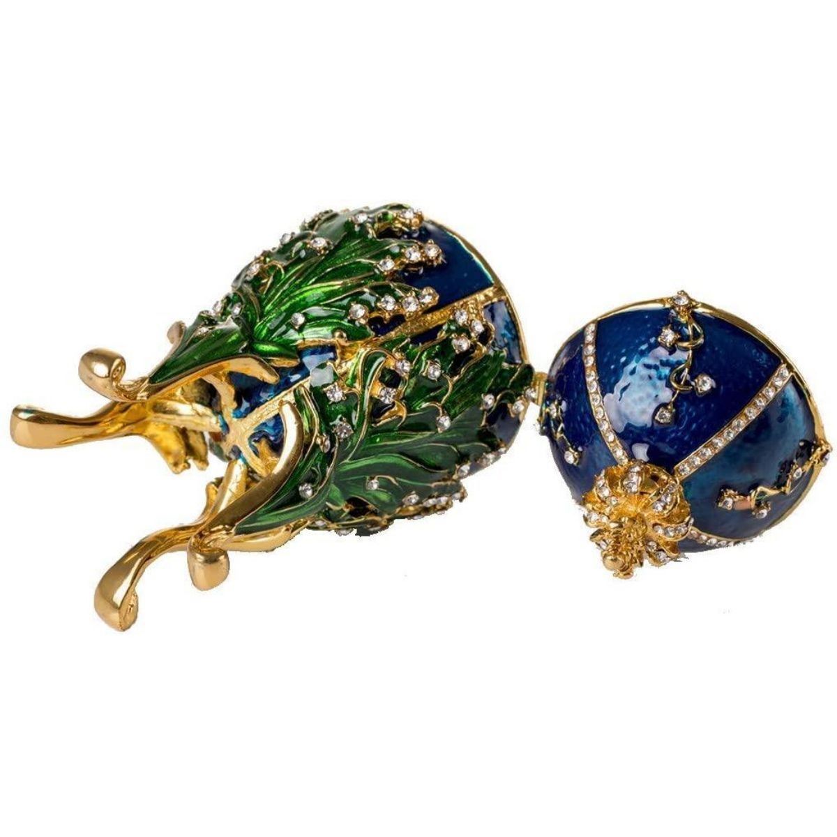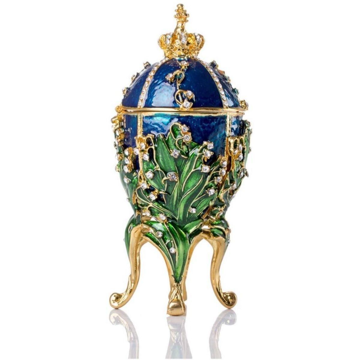 Lily of the Valley enamel trinket, jewel box egg. Enamel & gilt over pewter with embedded Austrian crystals. The top of the box, adorned with a gilt crown, lifts up on a hinge to reveal an enameled interior for storing trinkets or jewels. 5 1/4" H X 2 1/2" L X 2 1/2" W. Comes with gift box.Â