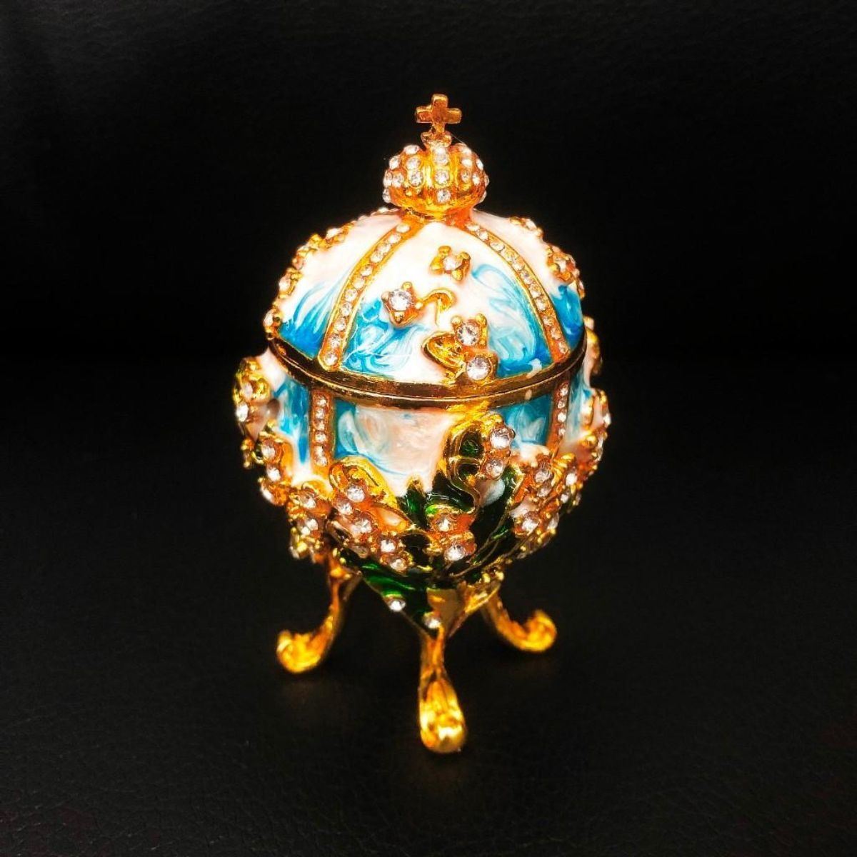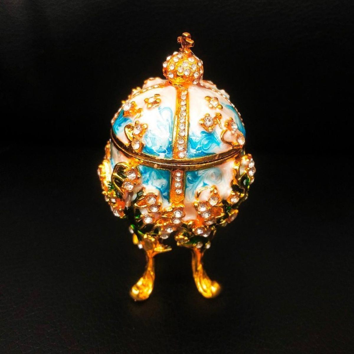 The Lilies of the Valley Egg is a jewelled Faberge egg made under the supervision of the Russian jeweller Peter Carl Faberge in 1898 by Faberge ateliers. The supervising goldsmith was Michael Perchin. The egg is one of the two eggs in the Art Nouveau style. It was presented on April 5 to Emperor Nicholas II, who gave it as a gift to Empress Alexandra Fyodorovna. The small replica of Russian emperor's crown is placed on the top of the egg. The Egg Is Inspired By The Lily Of The Valley Faberge Egg From The 19th Century. The egg can be used as a trinket jewel box.