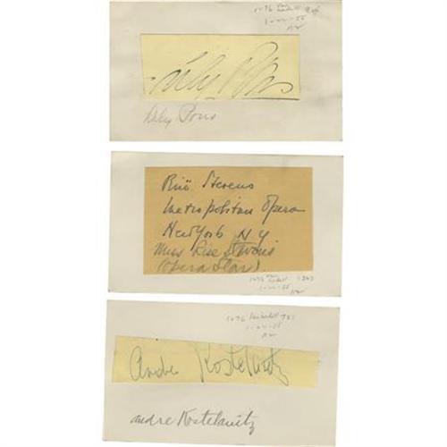 <B>Lily Pons, Rise Stevens, and Andre Kostelanitz Signatures</B></I> on individual slips of paper, mounted to cards, each 5" x 3". Total of three items, all in good to very good condition. <I>From the collection of Henry E. Luhrs</B></I> <BR><BR><b>Shipping:</b> Flat Material, Small (<a target="_blank" href="http://www.heritageauctions.com/common/shipping.php">view shipping information</a>)