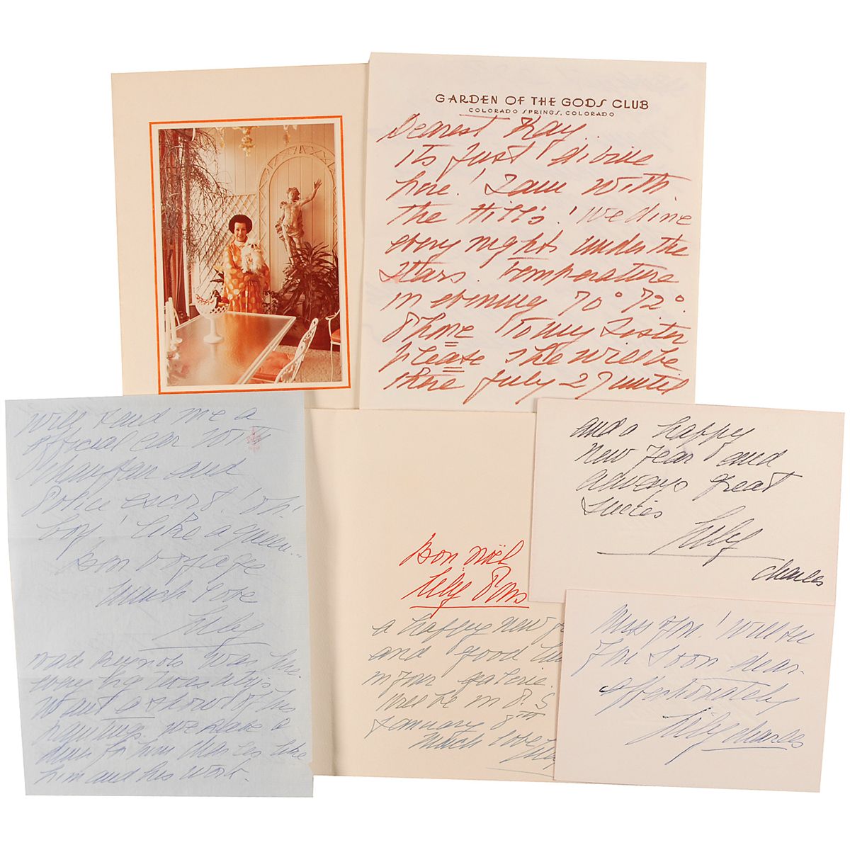 Five ALSs signed “Lily,” one inside a card with a portrait of Pons affixed to the front, mostly regarding plans and travels, or wishing a happy new year. One letter, in part: “It’s just divine here…we dine every night under the stars.” In overall fine condition. Accompanied by two original mailing envelopes, both filled out by Pons, and one unsigned greeting card with a photo of her on the front.