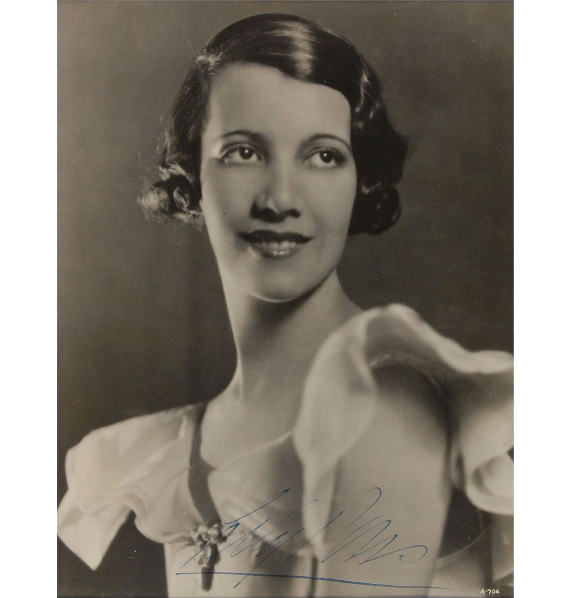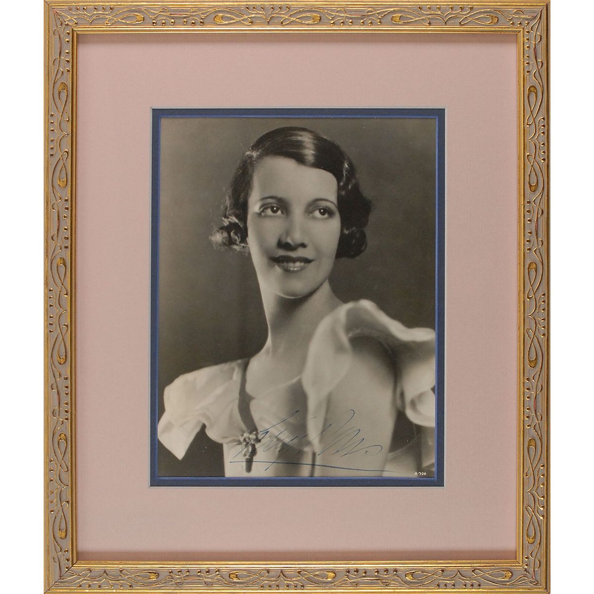 Gorgeous vintage glossy 7 x 9 photo of Pons in a lovely outfit, neatly signed at the bottom in fountain pen. Double-matted and framed to an overall size of 13 x 15. In fine condition, with light surface creases.