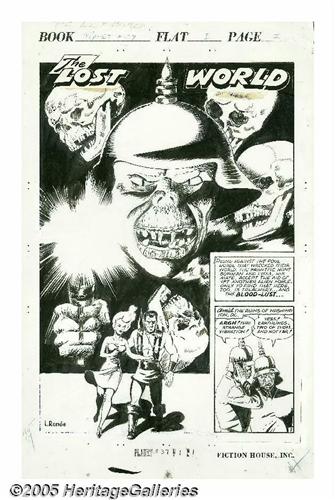 <B>Lily Renee - Planet Comics #37 Lost World Splash Page 1 Original Art (Fiction House, 1945).</B></I> Conquering space aliens hunt humans near the ruins of Washington D.C. in this spectacular distopian splash from the thriller, "Blood-Lust." Dig those <I>crazy</B></I> spiked helmets the aliens sport! Lily Renee was one of a trio of top-notch distaff artists working at Fiction House (the other two were Marcia Snyder and Fran Hopper) and she is perhaps most celebrated for her work on <B>Classics Illustrated</B></I> #8, "The Arabian Knights." This hard-hitting splash has an image area of 12.5" x 18", and the art is in Excellent condition.