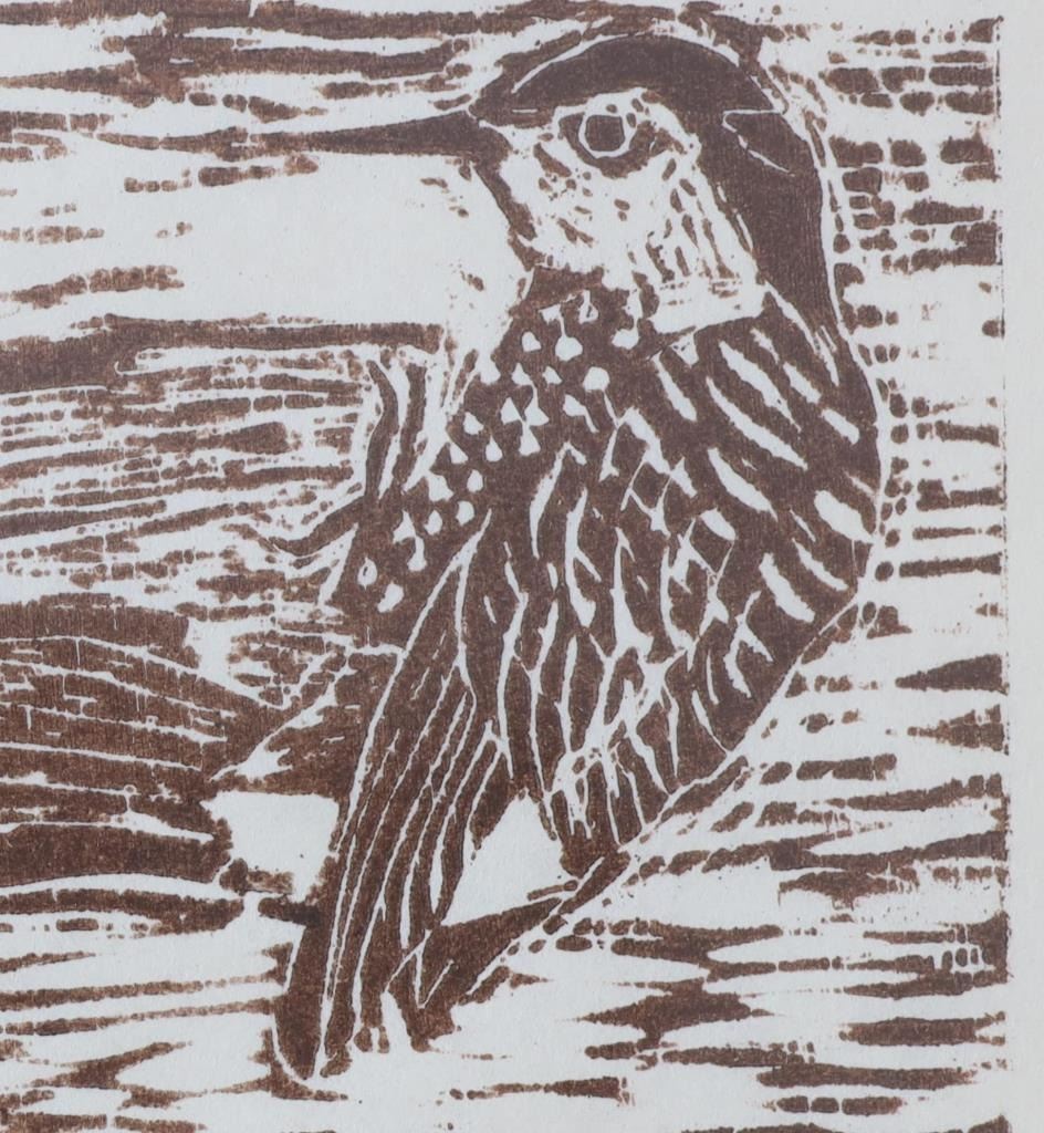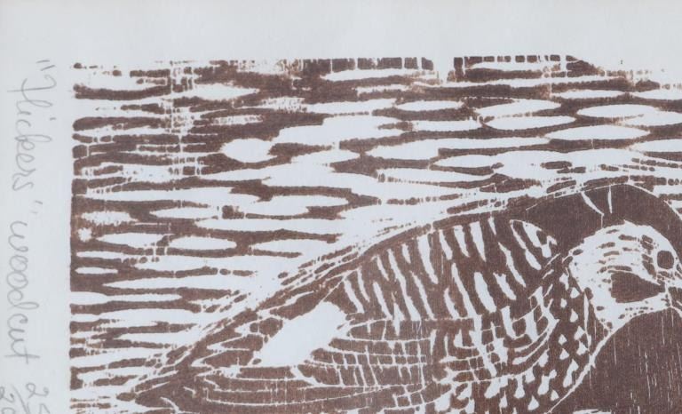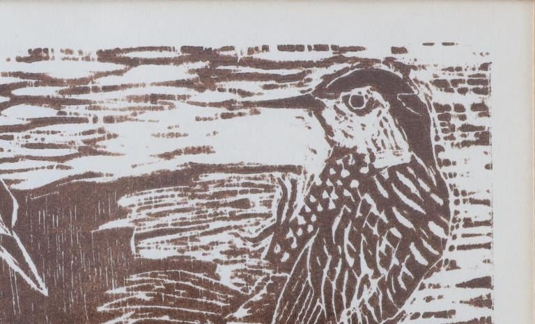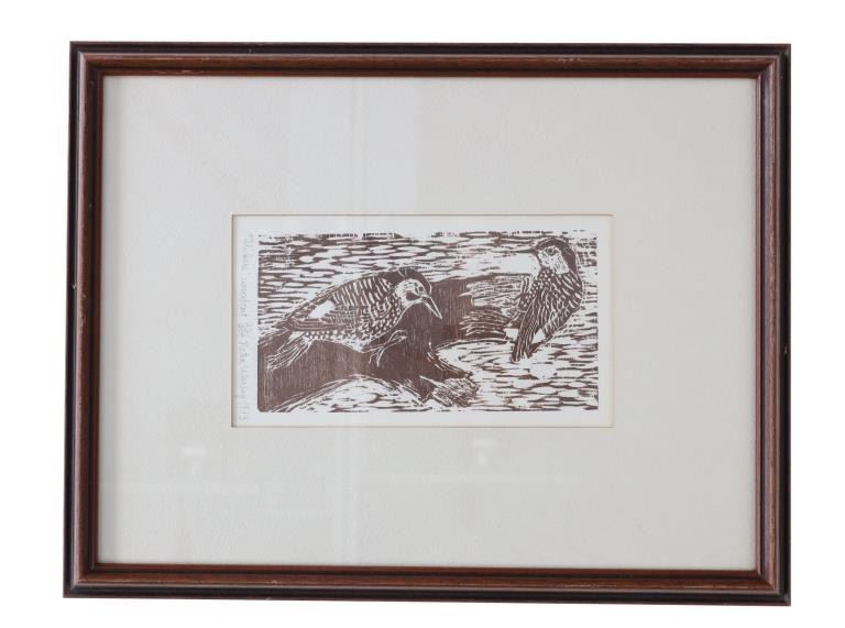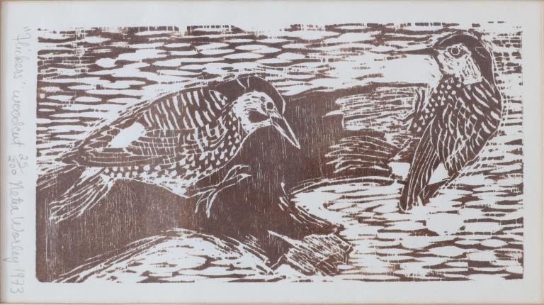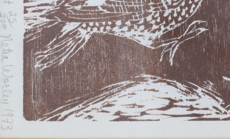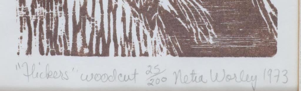 Featured in this lot is a signed, limited edition framed woodcut print by Netia Worley titled, "Flickers" from 1973. Netia Worley was born in Minnesota in 1928 and is know for her woodcut print making. Woodcut is one of the oldest forms of printmaking. Chisels, gouges and knives are used to carve a relief design into the surface of a wooden block. The raised areas that remain after the block has been cut are inked and printed. The print is set in a brown wooden frame, with textured matting behind glass and is numbered 25 out of 200. The print itself is marked "Flickers, Woodcut 25/200, Netia Worley 1973". The frame is custom made by Custom Frame & Gallery in Clear Lake, Iowa. Overall the piece shows good condition with no signs of obvious damage. The entire piece measures 17" L x 13" W.