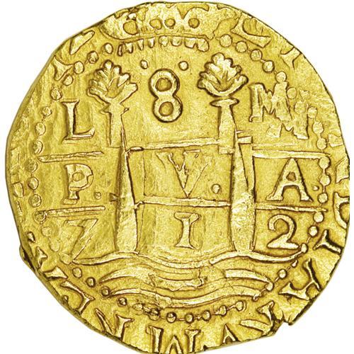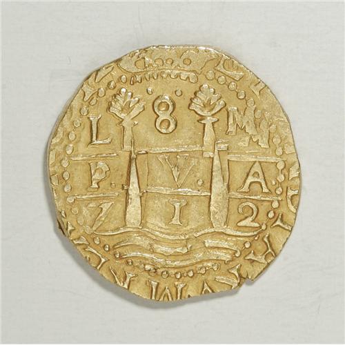 <B>Lima. Gold cob 8 Reales 1712-LM,</B></I> F-7, KM-38.2, Cal-93, XF-AU with some obverse doubling. Consigned with the Atocha silver coins, and not as an Atocha item, but without certificate to provide definite provenance.<BR><I>From the Treasures of the Sea</B></I><BR><BR><b>Shipping:</b> Coin/Currency (<a target="_blank" href="http://www.heritageauctions.com/common/shipping.php">view shipping information</a>)