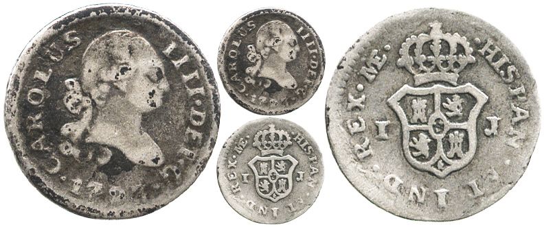 Lima, Peru, 1/4 real, Charles IV, 1793IJ. KM-99; CT-1373. 0.7 gram. VF with contrasting toning, slightly porous surfaces (probably salvaged), scarce and popular 4-year type.