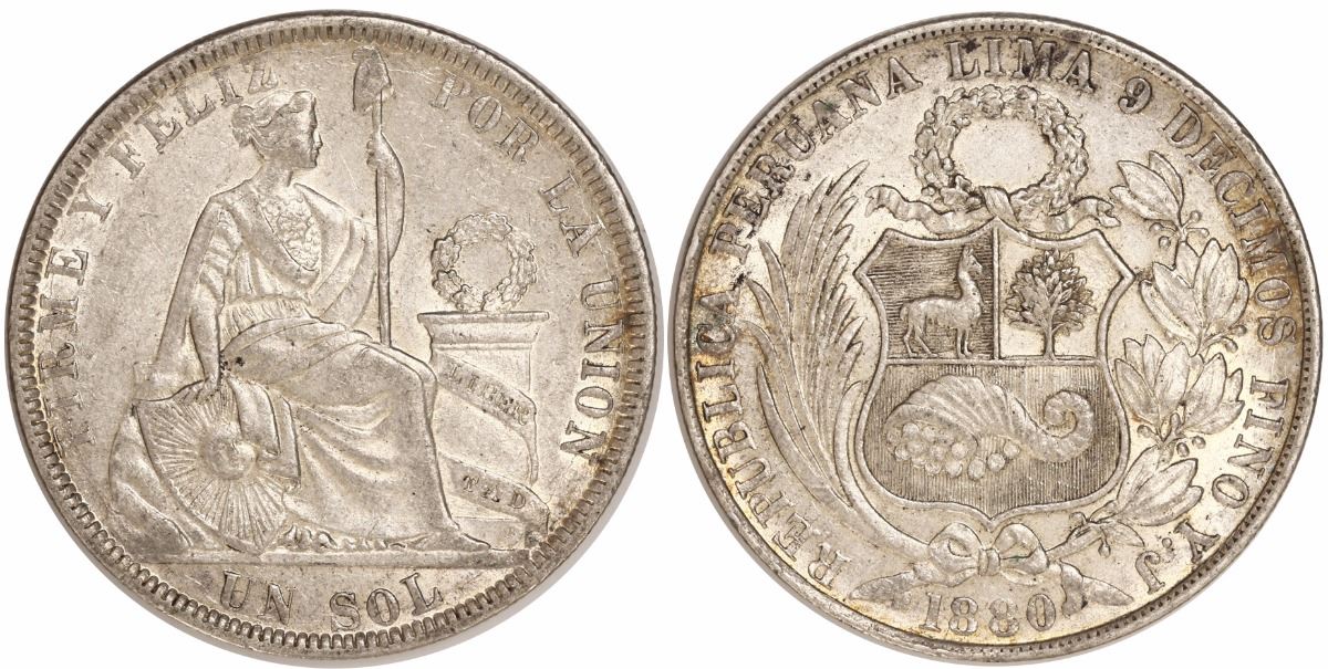 Lima, Peru, 1 sol, 1880YJ, no letters on ribbon, three berries. 25.03 grams. Lustrous UNC with minor bagmarks and light surface hairlines.