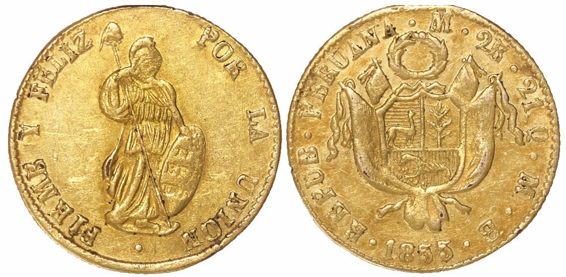 Lima, Peru, 2 escudos, 1855MB. KM-149.2. 4.00 grams. AU- with luster and very light toning.