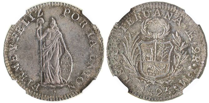 Lima, Peru, 2 reales, 1825JM, encapsulated NGC MS 63, finest (and only) known specimen graded by NGC