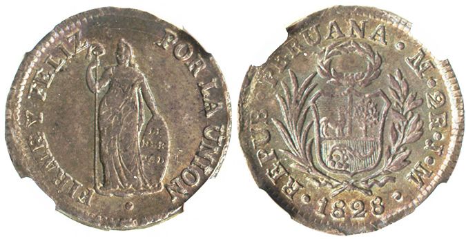 Lima, Peru, 2 reales, 1828JM, ex-Whittier, encapsulated NGC MS 62.