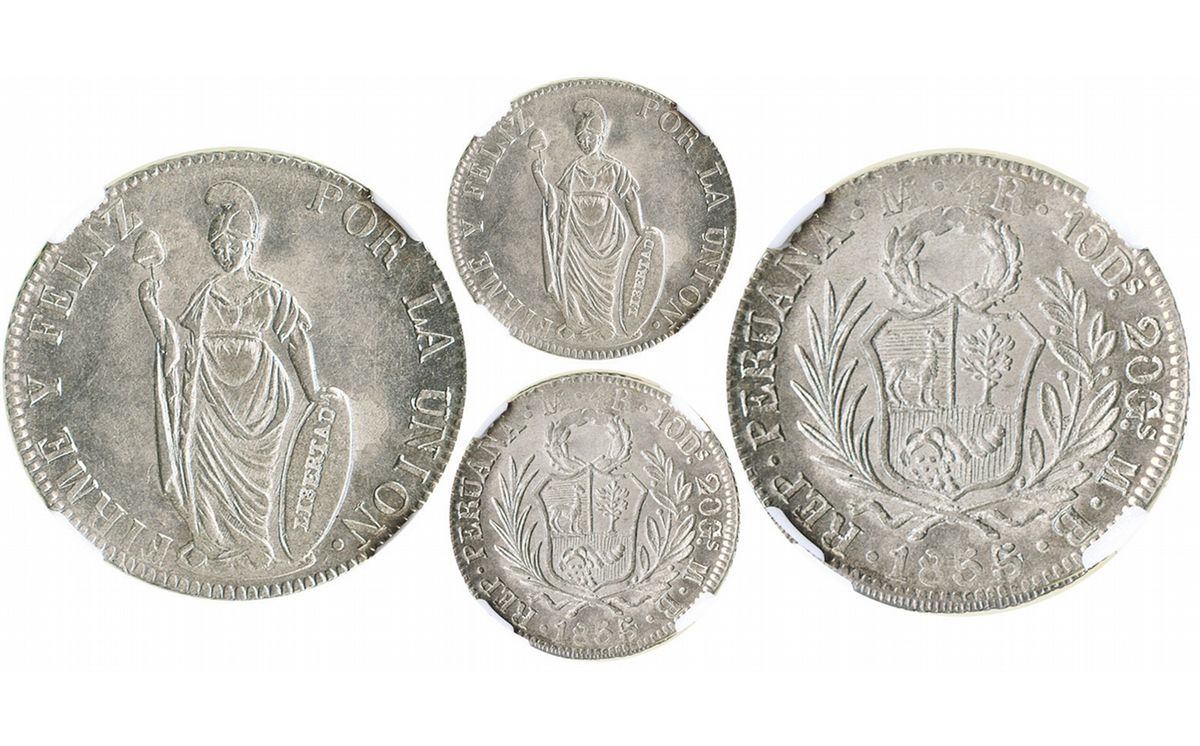 Lima, Peru, 4 reales, 1855/4MB, ex-Whittier, encapsulated NGC MS 64, finest known specimen graded by NGC. KM-151.3. Lustrous and well struck, completely devoid of wear, worthy of its lofty status atop the census. Pedigreed to the Whittier collection, as stated in the slab.