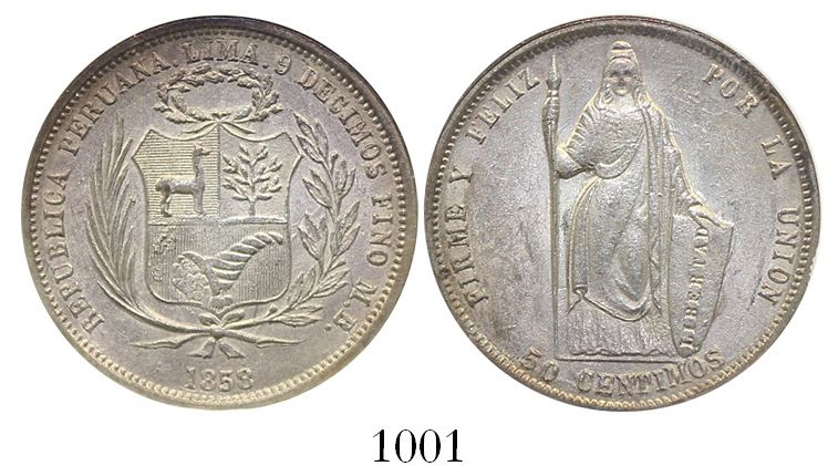 Lima, Peru, 50 centimos, 1858, encapsulated ANACS MS 62. KM-178. Muted luster and incipient toning, no wear, fairly nice strike, rare grade.