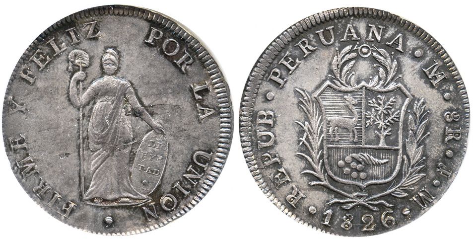 Lima, Peru, 8 reales, 1826JM, scarce first type with smaller effigy, encapsulated NGC MS 63.