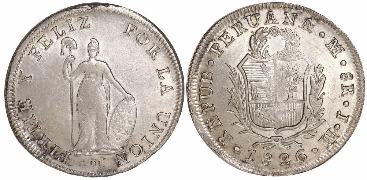 Lima, Peru, 8 reales, 1826JM. 27.69 grams. Highly lustrous UNC with light surface hairlines, weak centers as usual.