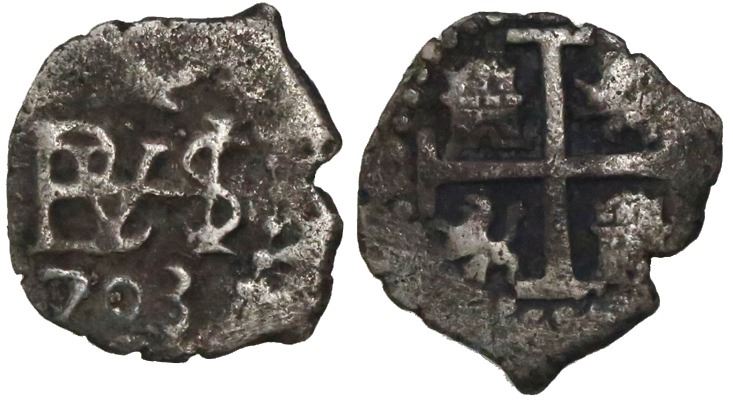 Lima, Peru, cob 1/2 real, 1703. S-L15a; KM-30; CT-1752. 1.55 grams. Choice specimen with full and bold monogram and date, nearly full cross, minimal surface corrosion, toned fields. Pedigreed to the Charles Eidel collection. Recovered from: Spanish 1715 Fleet, east coast of Florida
