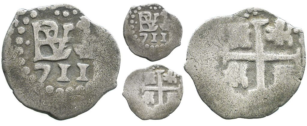Lima, Peru, cob 1/2 real, 1711. S-L20; KM-30; CT-1760. 1.7 grams. Very bold 711 date (lucky number!) below full monogram, good full cross, richly old-toned AVF, nice large flan. With old Almanzar's auction tag.