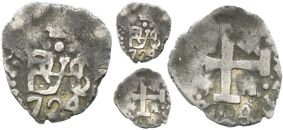 Lima, Peru, cob 1/2 real, 1724. S-L20; KM-30; CT-1773. 1.2 grams. Broad, thin flan with bold full monogram above date, nearly full cross with second date below, richly old-toned Fine.