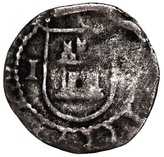 Lima, Peru, cob 1/4 real, Philip II, assayer I to left of castle, rare. S-unl; KM-unl; Cal-unl. 0.78 gram. Recent research by Jorge Proctor ("La inesperada existencia de una aparente marca de ensayador I en ciertas monedas de Lima y la acunacion de 1592" in Boletin Numismatico 112 [2022]) has shown that what we once thought was a mis-struck mintmark P is actually assayer I (boldly visible on this coin) for assayer Jacome Bricanino of 1592 only (this being the only denomination struck), the castle and lion both full and clearly without any other punches to left or right, some legend, toned and oxidized VF.
