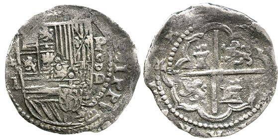 Lima, Peru, cob 1 real, Philip II, assayer Diego de la Torre, *-I to left, P-oD to right. S-L4; KM-7; CT-634. 3.1 grams. Typically sharply detailed full shield and cross-and-tressure, toned XF, but with some peripheral flatness and doubling on both sides.