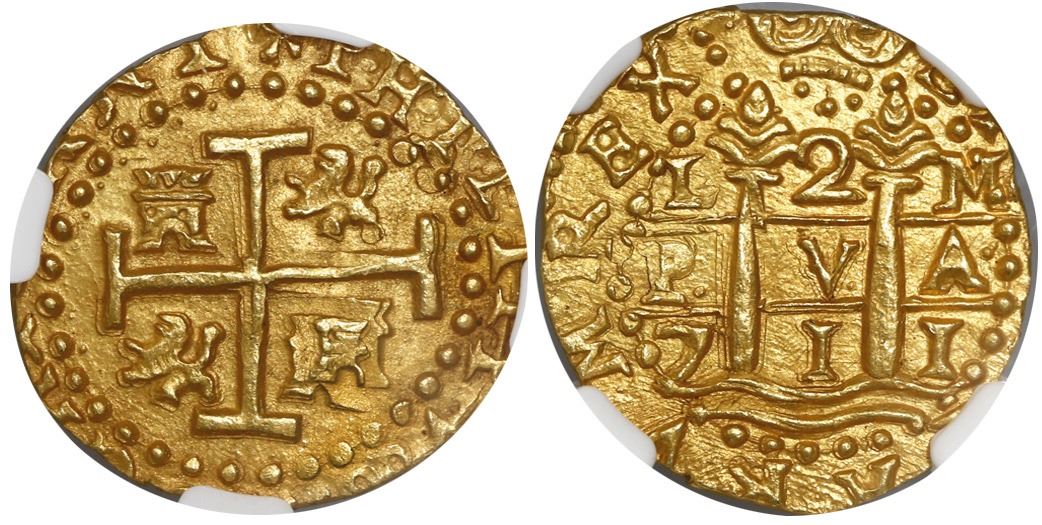 Lima, Peru, cob 2 escudos, 1711M, encapsulated NGC MS 64, from the 1715 Fleet (stated inside slab).