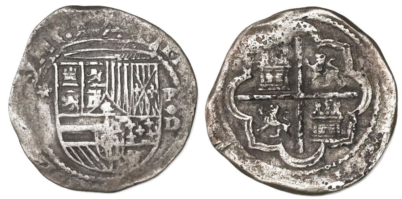 Lima, Peru, cob 2 reales, Philip II, assayer Diego de la Torre, *-(ii) to left, P-oD/X to right, very rare. S-L4; KM-9; CT-unl. 6.60 grams. Good full cross and shield, bold P-oD/X, toned VF+ with minor surface pitting, unusually weak peripheries.