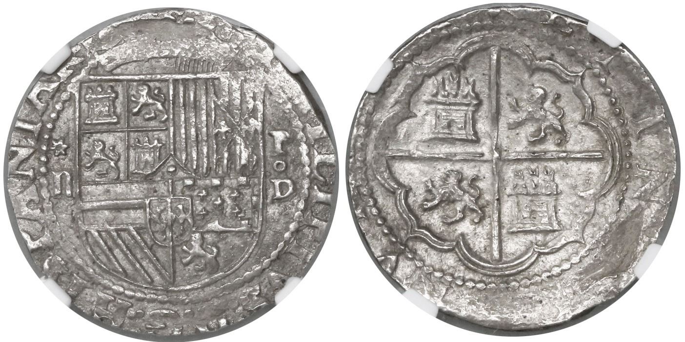 Lima, Peru, cob 2 reales, Philip II, assayer Diego de la Torre, *-ii to left, P-oD to right, encapsulated NGC AU 50. S-L4; KM-9; CT-487. 6.85 grams. Choice full shield and cross, much legend, very lightly toned.