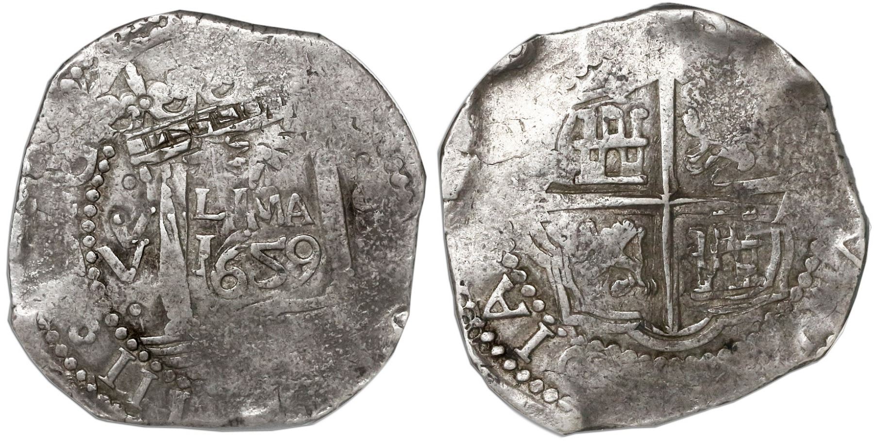 Lima, Peru, cob 8 reales, 1659V, assayer to left, denomination to right (Series IA), encapsulated NGC XF 40. S-L5; KM-18.1; CT-262. Full LIMA above full date 1659, the last digit of which appears to be possibly punched over an erased 8 (could the dies have been originally made in 1658?), with full dot-V-dot to left and king's ordinal IIII in legend despite flatness and typical doubling, the cross full but with peripheral flatness, lightly toned, rare as non-salvage.
