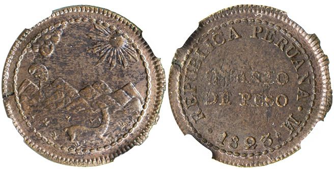 Lima, Peru, copper 1/4 peso, 1823, provisional coinage, encapsulated NGC MS 62 BN, finest known spec