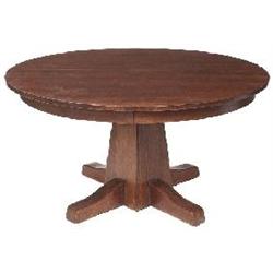 Limbert dining table, #1499, circular top over a flared pedestal base with four extended feet, two original 11”leaves, original finish with light recoat to top, branded signature, 54”dia. X 30”h, very good condition