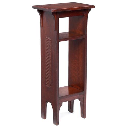Unusual Limbert magazine stand, #602, rare form with rectangular top and corbel supports over two shelves, supported by sides with inset cane panels, fine original finish, branded signature, 15"w x 18"d x 34"h, excellent condition