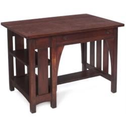 Limbert table, #105, single drawer over six legs with corbled supports and book rack on one side with single wide slat, original copper hardware, branded signature, original finish to base, top refinished, 42”w x 28”d x 29”h, very good condition