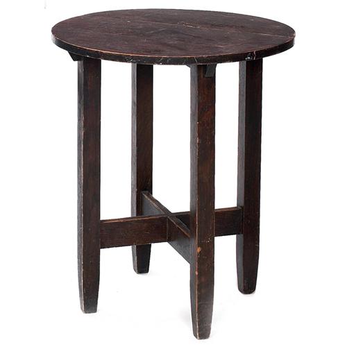 Limbert tea table, #190, circular top over cross stretcher base with tapered legs, worn original recoated finish, branded signature, 22"dia. x 26"h, some looseness to joints, good condition
