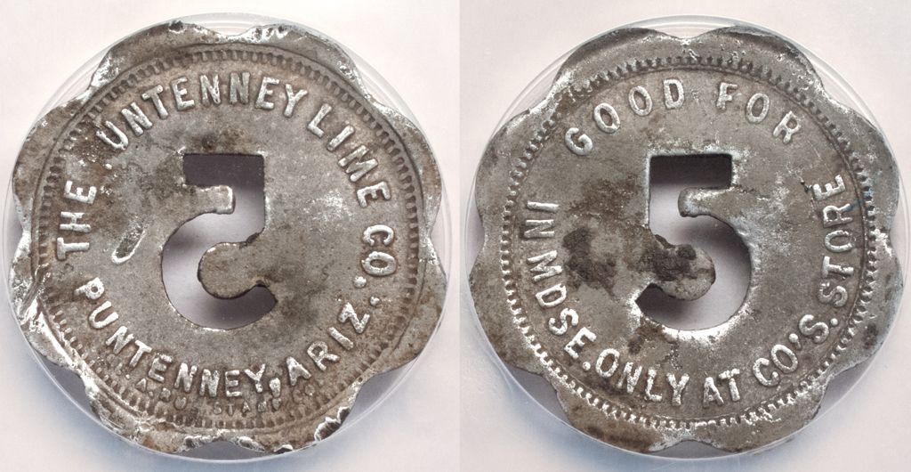Puntenney Lime Co / Puntenney, Ariz // GF 5c in Mdse at co's Store . Large '5' stamped out of middle. Unlisted. Named for George Puntenney who built the first lime kilns here .First had a post office under the name Puntew which was a misspelling by the post office department. Post office was established on April 26, 1892 under the name George Puntenney P.M. City: PuntenneyCounty: YavapaiState: AZDate: