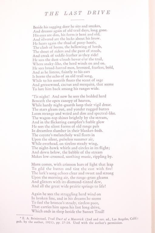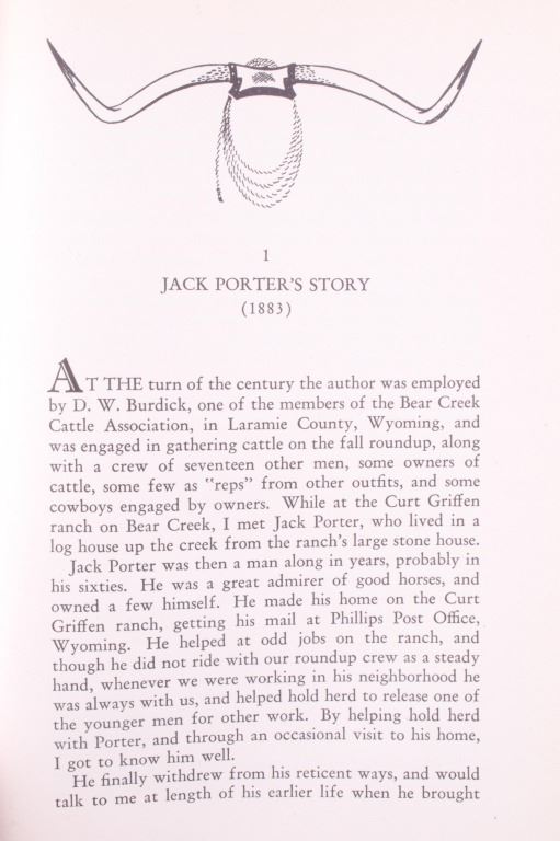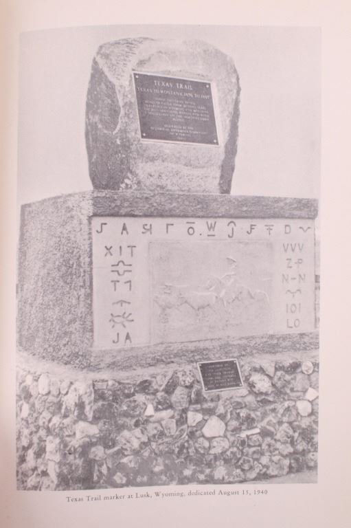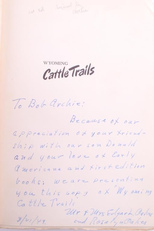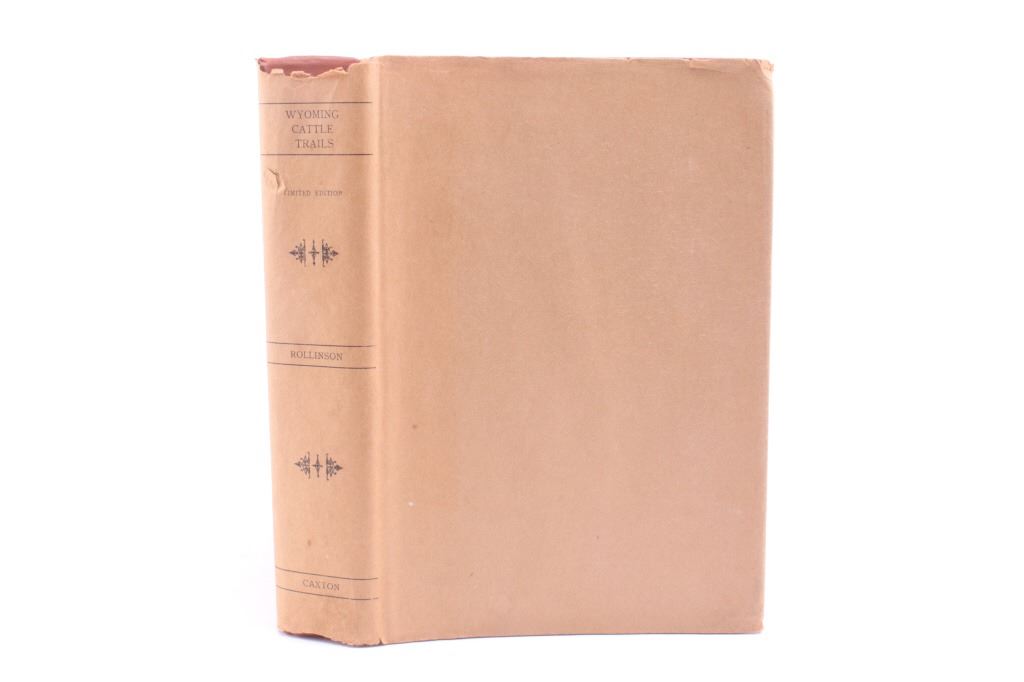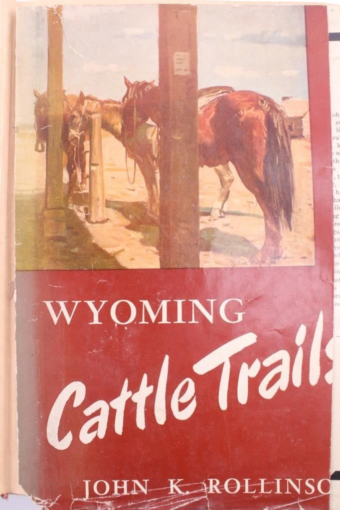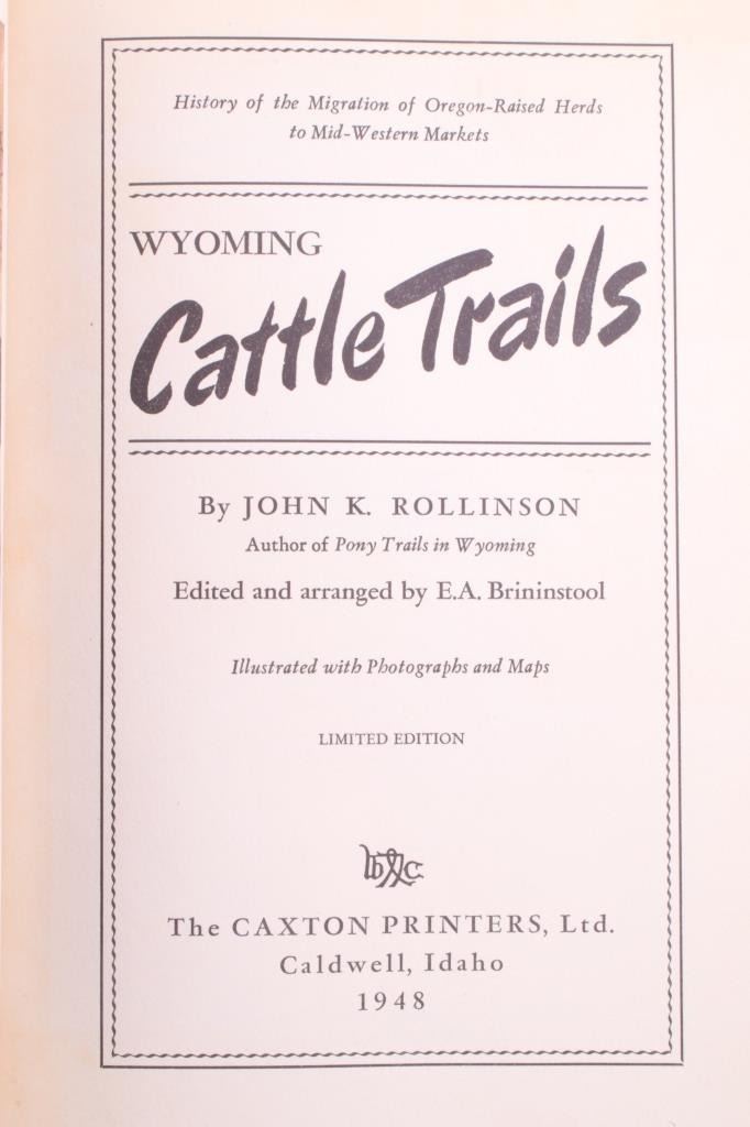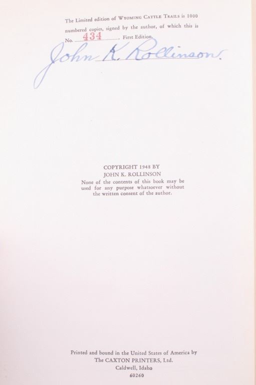For your consideration is this 1948 first edition, signed copy of “Wyoming Cattle Trails” by John K. Rollinson. This is a limited edition copy (#434 of 1000) with illustrations and maps included, providing a history of the migration of Oregon-raised herds to mid-western markets. The condition of this book is good and includes original cover, with no obvious signs of damage and slight browning to the pages consistent with age. The measurements of this book are 8 1/2" x 6 3/4".