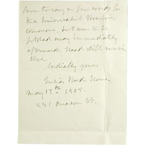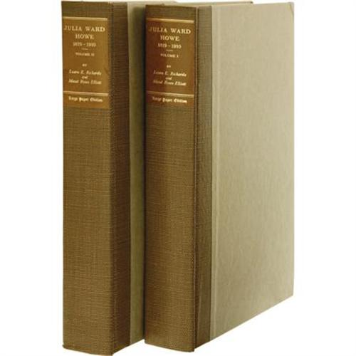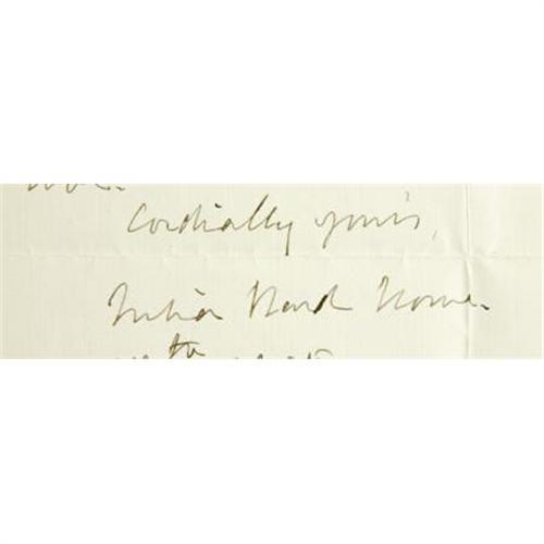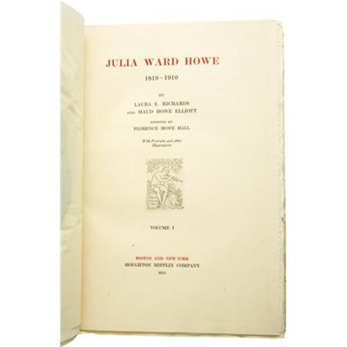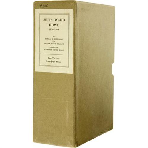 <B>Limited Edition Julia Ward Howe Biography with Autograph Message Signed Laid-In</B></I>.<BR><B>Laura E. Richards and Maude Howe Elliott: Numbered Limited Edition of </B></I><B><I>Julia Ward Howe 1819-1910</B></I></B></I> (Boston and New York: Houghton Mifflin Company, 1915), Large Paper Edition, two volumes, 826 total pages including Index, Number 410 of 450 copies, brown quarter cloth with light brown paper boards and gilt lettering on brown morocco spine title plates, 8vo (6.5" x 9.25"), original slipcase. Deckled edges, most gatherings uncut. A leaf from an original Howe manuscript is bound-in between the half-title page and the frontispiece. Howe was a tireless abolitionist, social critic, women's suffrage advocate, and poet, most remembered as the author of "The Battle Hymn of the Republic." This engaging two volume biography is one of the few recognized masterworks of Howe scholarship. The set is in about fine condition, with only lightly bumped corners. A scarce limited edition set of Howe biography.<BR>Julia Ward Howe Autograph Message Signed. Two pages, 5" x 6.75", 241 Beacon St., Boston, May 17, 1905, Thank You note, presumably to a women's group, ink. The short note reads in part: "<I>Many thanks for the cheque. I hoped that you would all guess that nothing but indisposition would have kept me from Monday's meeting. I had a severe attack of vertigo and faintness on May 10th, and was ordered to avoid all occasions of brain fatigue. I am trying to keep well for May 25th, as I am to say a few words to the Universalist Women tomorrow, but am to be fetched away immediately afterwards...Cordially yours, Julia Ward Howe May 17th, 1905. 241 Beacon St.</B></I>" The letter is in fine condition, with usual mail folds present. It offers a rare glimpse into the world of a staunch activist and a truly significant historical American personage. <BR><BR><b>Shipping:</b> Books & Catalogs (<a target="_blank" href="http://www.heritageauctions.com/common/shipping.php">view shipping information</a>)