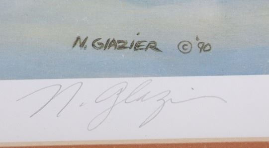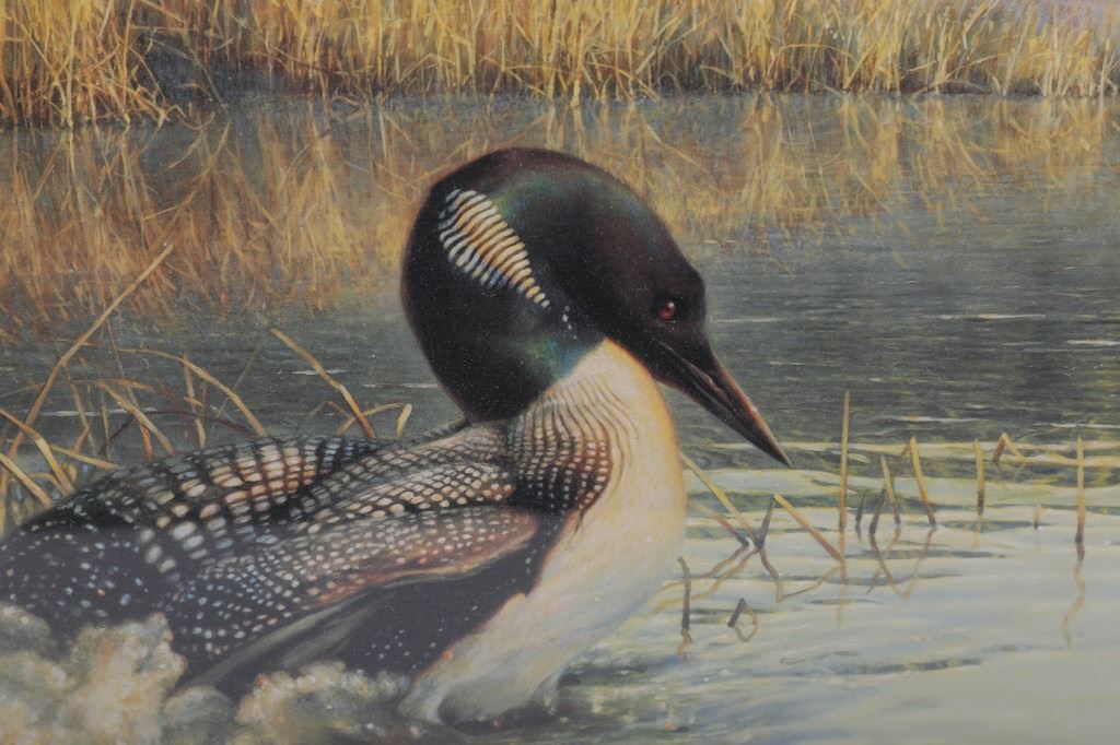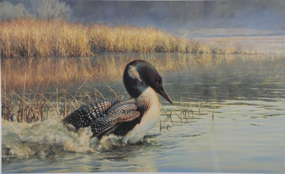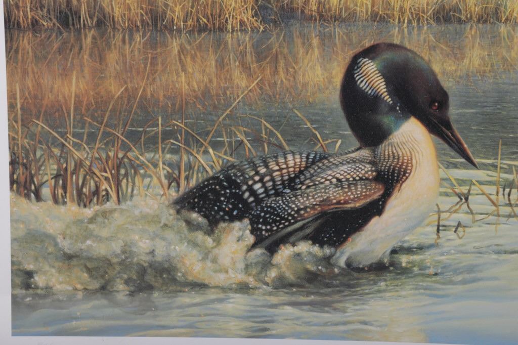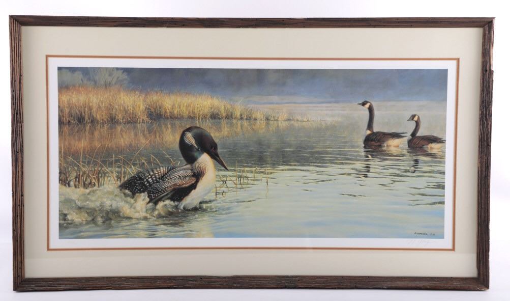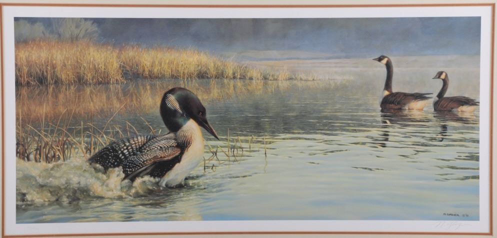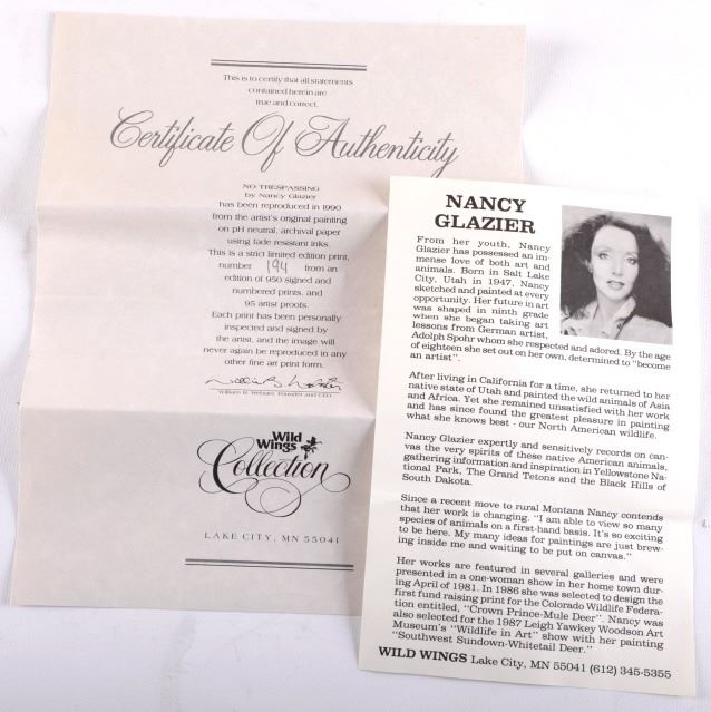 Featured in this lot is a limited edition print by Nancy Glazier titled, "No Trespassing" from 1990. Glazier knew she wanted to be an artist from early childhood. In her teens, she lived in Wyoming where she immersed herself in the rugged, western terrain. There she was mentored and taught by artist Adolph Spohr, who gave her private instruction and taught her how a professional uses paint and brush…how to observe and self-correct. The artist has taken hands-on anatomy classes that enable her to paint an amazingly accurate portrait of an animal from its bone structure to muscles to hair, bringing it life on her canvas. Her paintings have been featured at prestigious shows throughout the country, and two of her works hang in the Museum of Church History and Art in Salt Lake City. The print features a Common Loon landing on the banks of a lake while two Canadian Geese drift by in the background. The art shows fine attention to detail, especially in the water. The print comes in a vintage wood frame, double matted and set behind glass. The bottom right features a signature on the print reading, "N. Glazier © '90" and another hand written signature on the white border of the print reading, "N. Glazier". The bottom left of the print reads, "194/950" showing that it is a limited edition print. The print comes with a small artist bio sheet and a certificate of authenticity. The art measures 14 3/4" L x 31 1/2" W. The entire piece measures 21" L x 37 1/4" W.