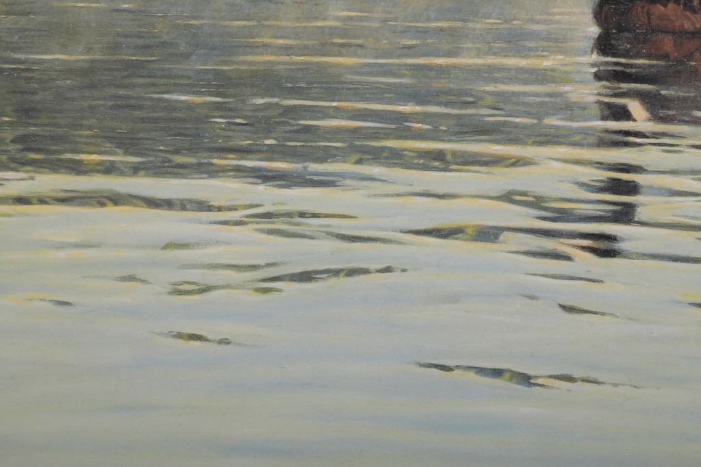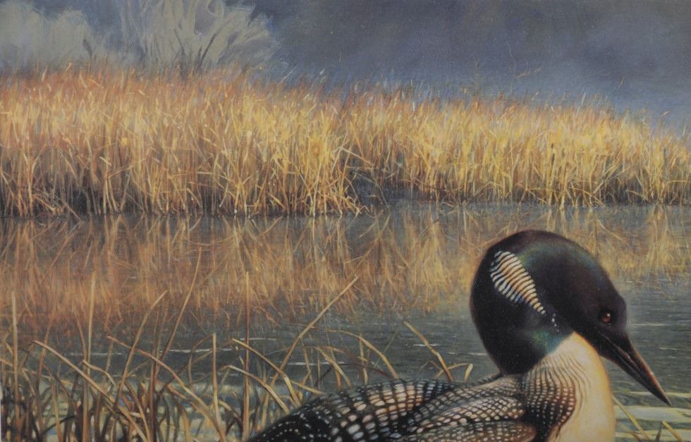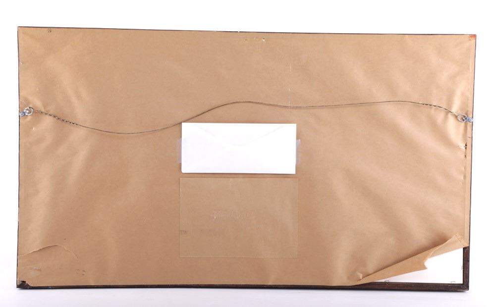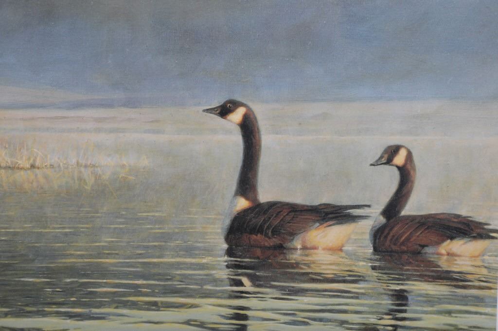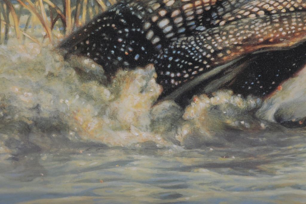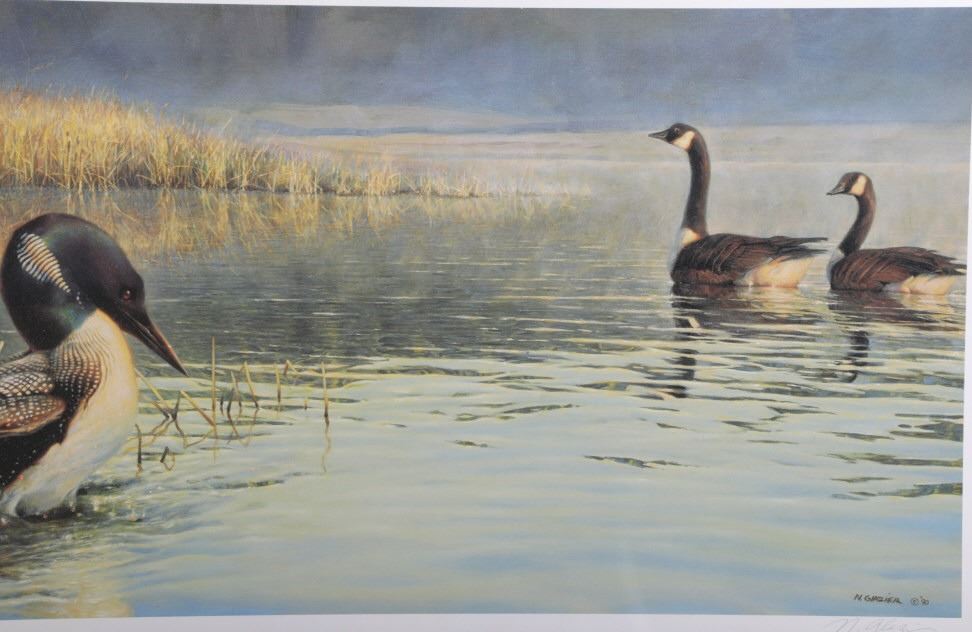 Featured in this lot is a limited edition print by Nancy Glazier titled, "No Trespassing" from 1990. Glazier knew she wanted to be an artist from early childhood. In her teens, she lived in Wyoming where she immersed herself in the rugged, western terrain. There she was mentored and taught by artist Adolph Spohr, who gave her private instruction and taught her how a professional uses paint and brush…how to observe and self-correct. The artist has taken hands-on anatomy classes that enable her to paint an amazingly accurate portrait of an animal from its bone structure to muscles to hair, bringing it life on her canvas. Her paintings have been featured at prestigious shows throughout the country, and two of her works hang in the Museum of Church History and Art in Salt Lake City. The print features a Common Loon landing on the banks of a lake while two Canadian Geese drift by in the background. The art shows fine attention to detail, especially in the water. The print comes in a vintage wood frame, double matted and set behind glass. The bottom right features a signature on the print reading, "N. Glazier © '90" and another hand written signature on the white border of the print reading, "N. Glazier". The bottom left of the print reads, "194/950" showing that it is a limited edition print. The print comes with a small artist bio sheet and a certificate of authenticity. The art measures 14 3/4" L x 31 1/2" W. The entire piece measures 21" L x 37 1/4" W.