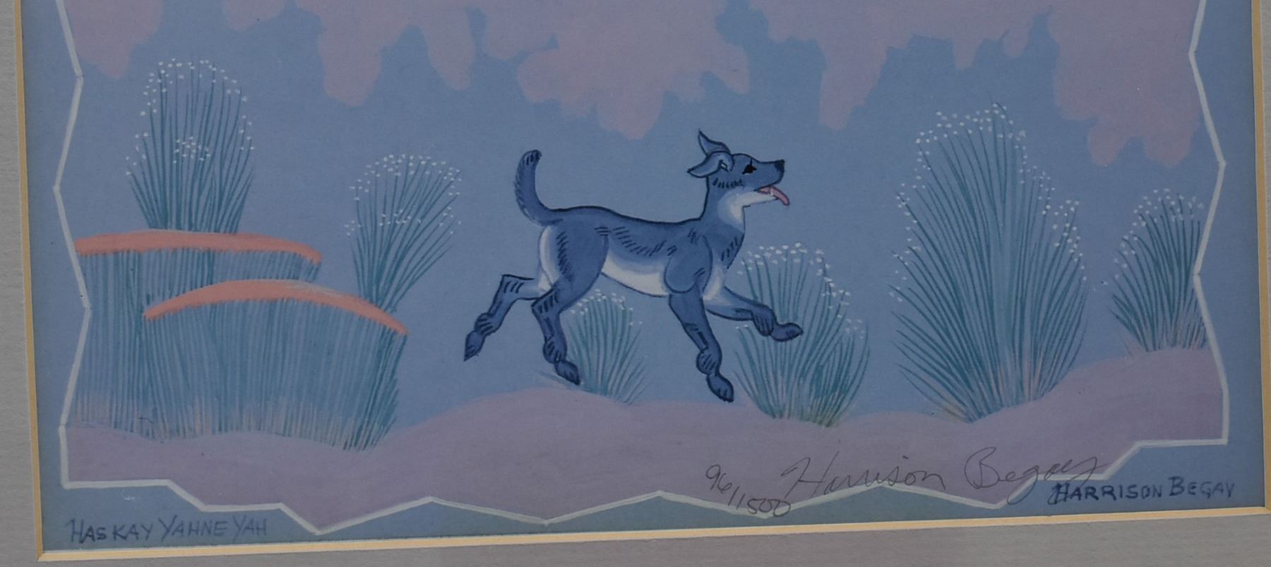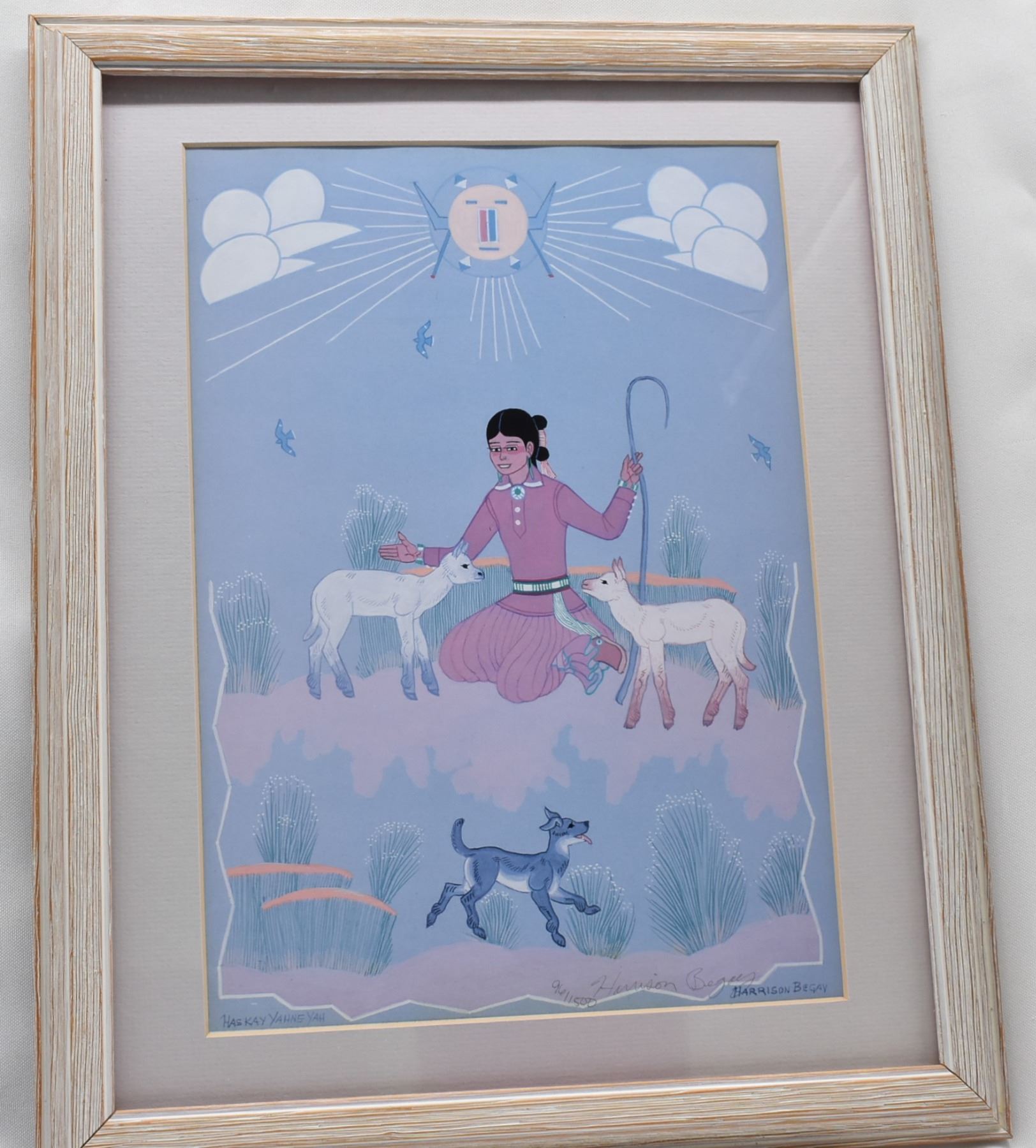 Limited Ed. Native American Navajo Print by Harrison Begay #96/1500, signed and numbered, framed, matted, and under glass, overall framed measurement of 12.5" x 15.5" FYI: ''Harrison Begay, also known as Haashk yah Niya (meaning ''Warrior Who Walked Up to His Enemy'' or ''Wandering Boy'') (November 15, 1914 or 1917 - August 18, 2012) was a renowned Din‚ (Navajo) painter, printmaker, and illustrator. Begay specialized in watercolors, gouache, and silkscreen prints. He was born in Whitecone, Arizona. From 1942 to 1945, during the Second World War, Begay served in the US Army Signal Corps in Germany, Iceland, the Czech Republic, and other parts of continental Europe. Begay took part in the D-Day storming at Normandy Beachhead. Harrison Begay died on 18 August 2012 in Gilbert, Arizona at the age of 95.''