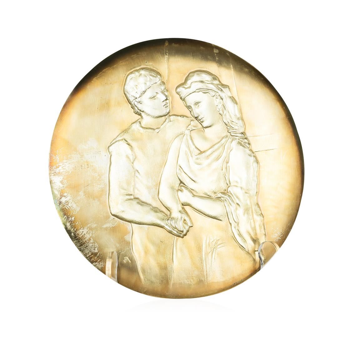 One pure silver 1973 collector's plate from the Hamilton Mint featuring Picasso's "The Lovers'". The plate measures 8" wide and weighs 276 grams.