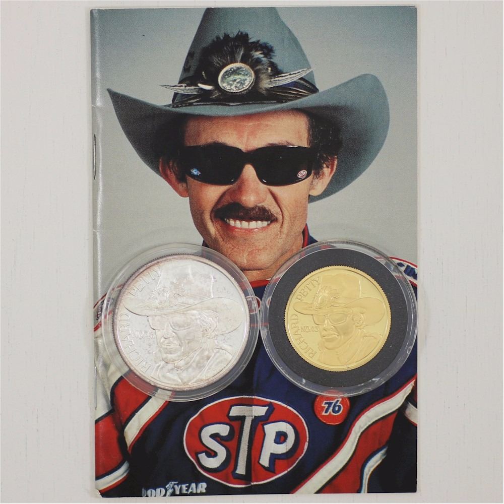 Limited Edition 1oz Gold and 1oz Silver Set in Wooden display box featuring Nascar Driver Richard Petty! Limited Mintage only 200 Sets! This is set #108. Set comes with informational booklet, coins have some light patina (Tax exempt)