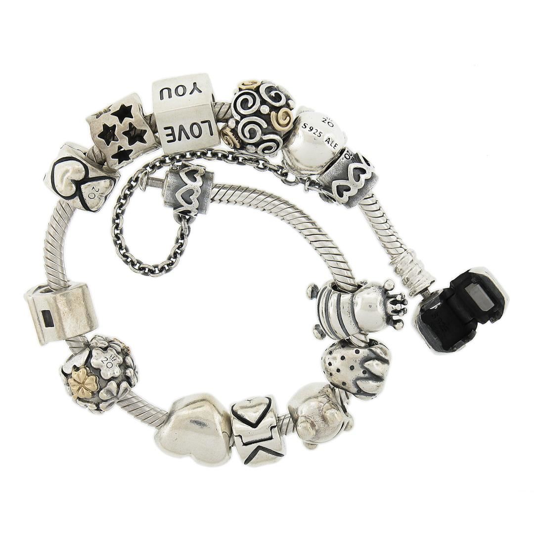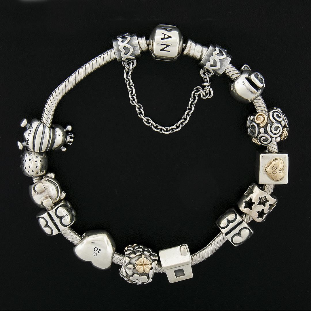 A silver with yellow gold accents moments chamr bracelet by pendora. It weighs a total of 58.5 grams, measures 11.2mm wide, and measures 7 inches in length.