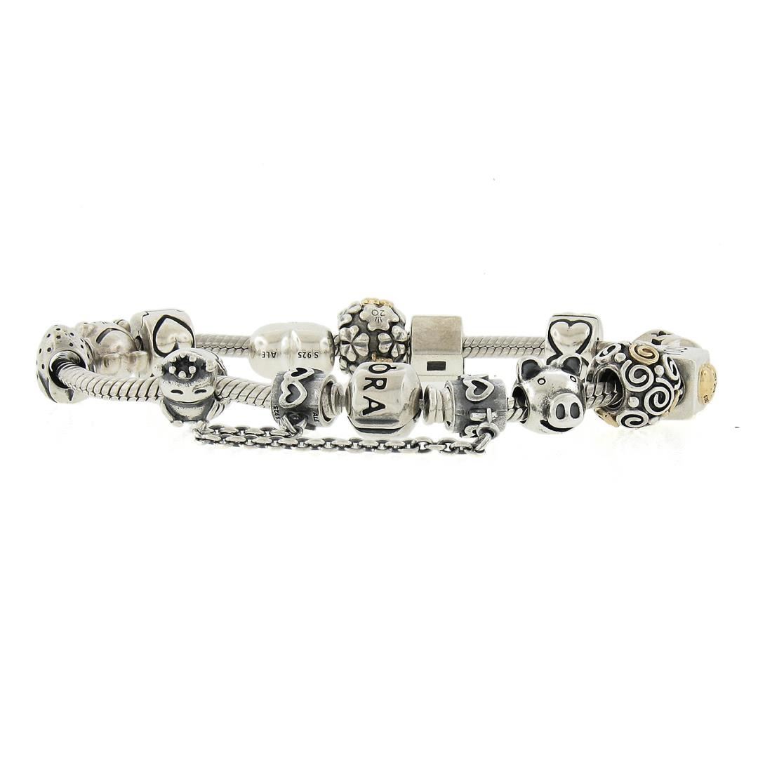 A silver with yellow gold accents moments chamr bracelet by pendora. It weighs a total of 58.5 grams, measures 11.2mm wide, and measures 7 inches in length.