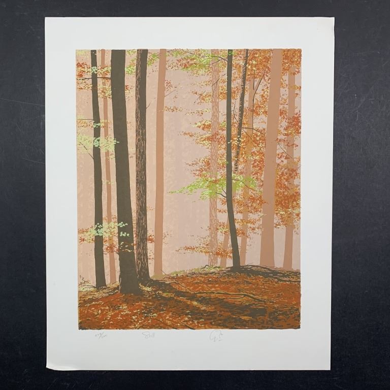 A limited edition autumn scene print, signed lower middle, and titled and nubered 298/300 lower left. This piece is of a forest scene, from inside the forest, during autumn as the trees' leaves have changed colours. This piece is in very good excellent condition with a very minor crease upper left corner, crease lower left corner, and a crease upper right corner.