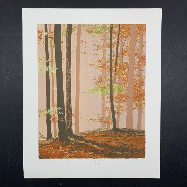A limited edition autumn scene print, signed lower middle, and titled and nubered 299/300 lower left. This piece is of a forest scene, from inside the forest, during autumn as the trees' leaves have changed colours. This piece is in near excellent condition with small crease lower left corner.
