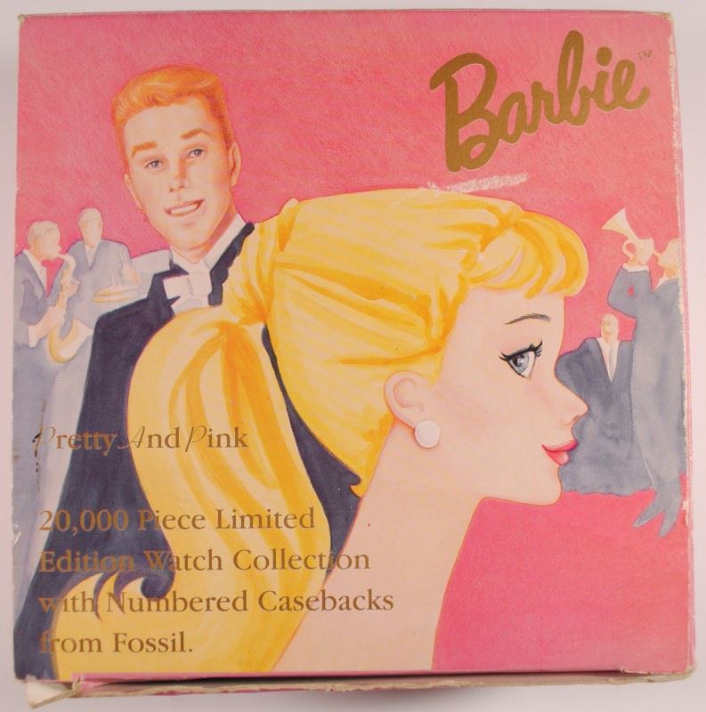 Never worn Barbie 35th Anniversary Fossil Watch. In its original box with all paperwork and stored for the last 21 years! This is a numbered limited edition of 19689/20,000. Pink leather band. Includes lunch box and gold tone Barbie pin with charm dangles of a high heeled shoe, sunglasses and a vintage telephone receiver. Battery not included. COA. EST 140.00-160.00