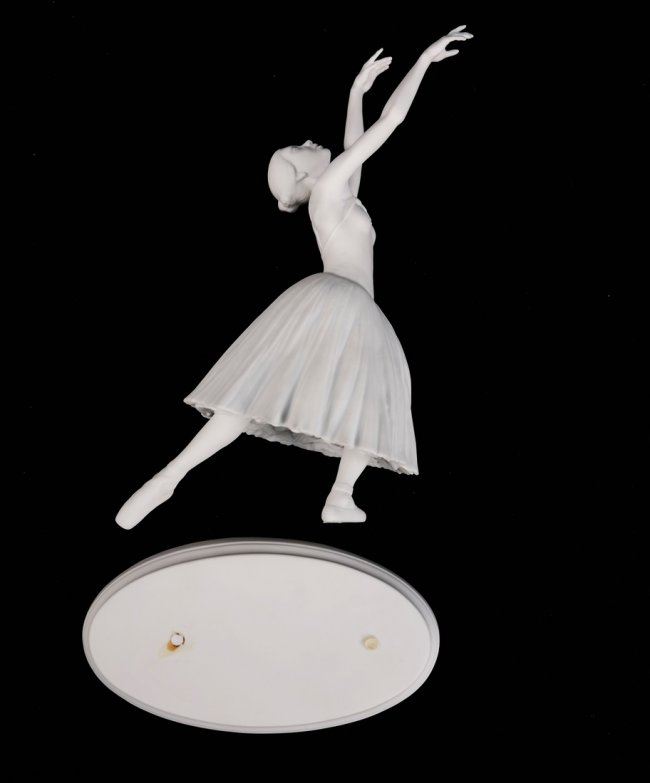 Porcelain ballet figurines comprising: 1.) Giselle [9 3/4" H x 6 1/2" W]. 2.) Don Quixote [11" H x 6 1/2" W]. Foot broken off base. 3.) Nutcracker [9 1/2" H x 6 1/2" W]. Foot broken off base. 4.) Swan Lake [4 1/2" H x 6 1/2"]. Slightly stained.