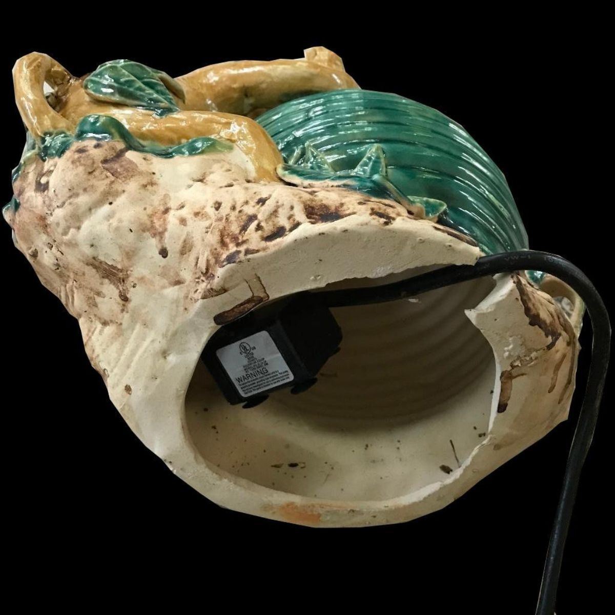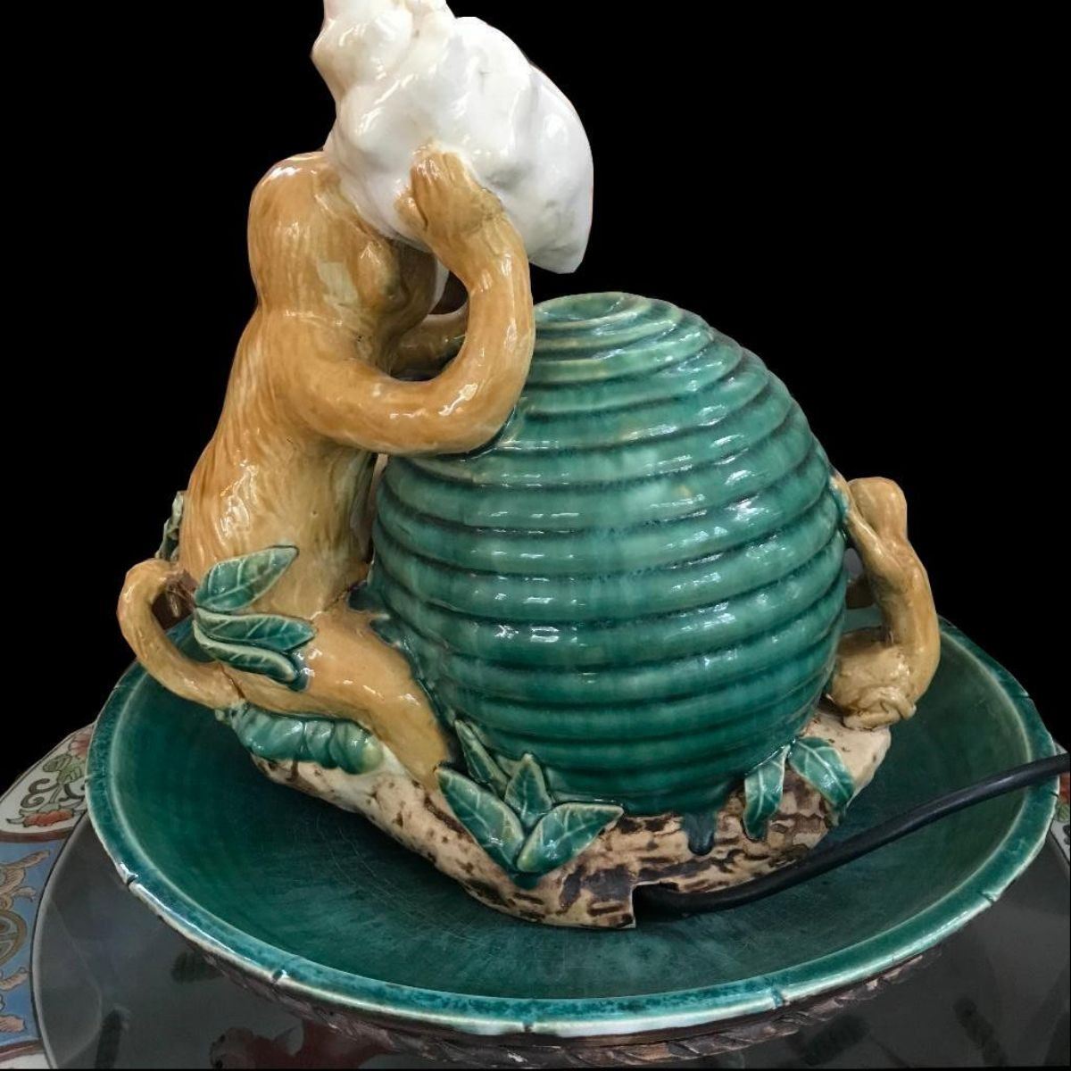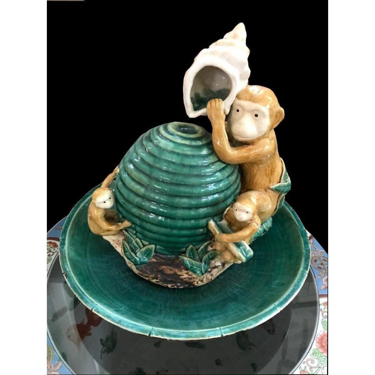 Rare, c.2000, artist original limited edition ceramic figural table fountain, featuring a large monkey chimpanzee holding a shell, flanked by smaller monkeys. Water pours from the shell & recirculates from base. Appeared in the Neiman Marcus catalog circa 2000. Two piece set with fountain & ceramic base dish with working motor. * flaw on one of the smaller figure's arms, created during the firing process of production. 15" D X 15" H. Â