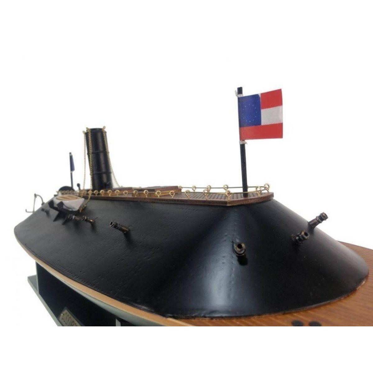 Museum-quality scale Civil War replica of one of history’s most famous warships, produced as a Limited Edition model of the famous CSS Virginia. Built from scratch, 1:96 scale, accurate model with individual hull plates carved into the design, deck planking clearly visible, real lattice grating along upper deck, highly-detailed lifeboats, railing along entire upper deck, metal anchors at bow, high quality woods used in construction, brass cannons, cleats, vent grates & other features on deck. Rotating propeller & moving rudder. Accurately hand-painted with cloth flags included. Limited production run only 100 of these Civil War replicas. Wooden display base separates from CSS Virginia model warships. Metal nameplate included for display. 34" Long x 7" Wide x 9" High. NOTE: Simple assembly is required, with instruction for the purpose of shipping without issue.