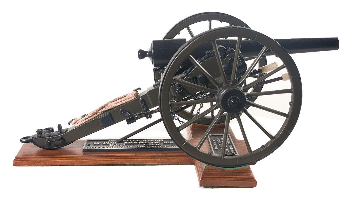Approximately 9" long, 10" wide display model of a Parrott Rifle Model 1863 with wooden stand featuring a model identification plaque and plaque stating that this is the 23rd of 25 models handcrafted by R. Albert Norgan of Gettysburg, Penn. Excellent with a few light handling marks.